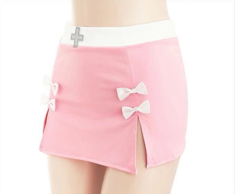 ミニスカートはリボンデザインがアクセントになり、ピンクの可愛らしさを存分に楽しめます。